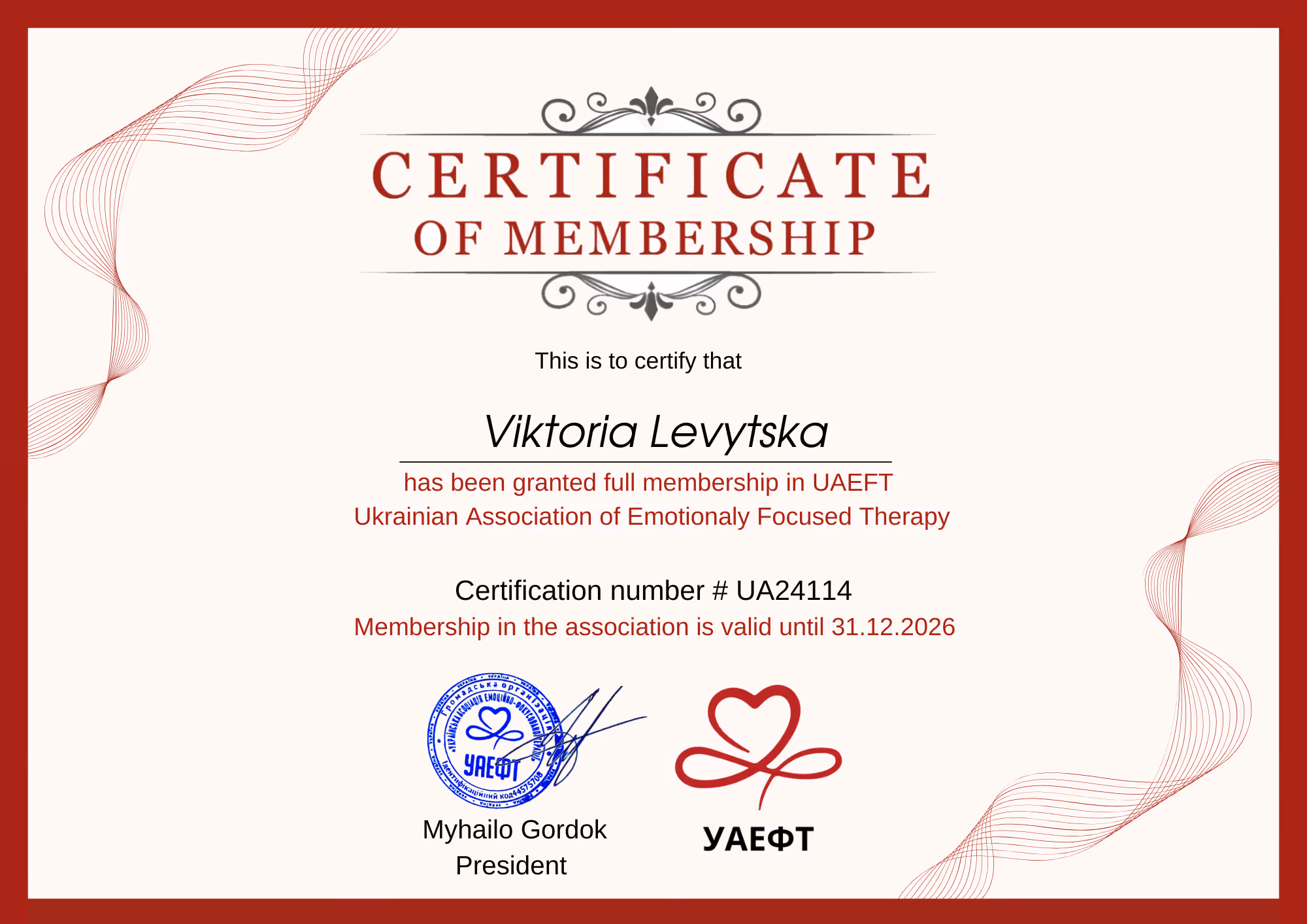 Міжнародна сертифікаційна базова программа в методі ЕФТ (Емоційна-фокусована терапія пар), 2022 р.