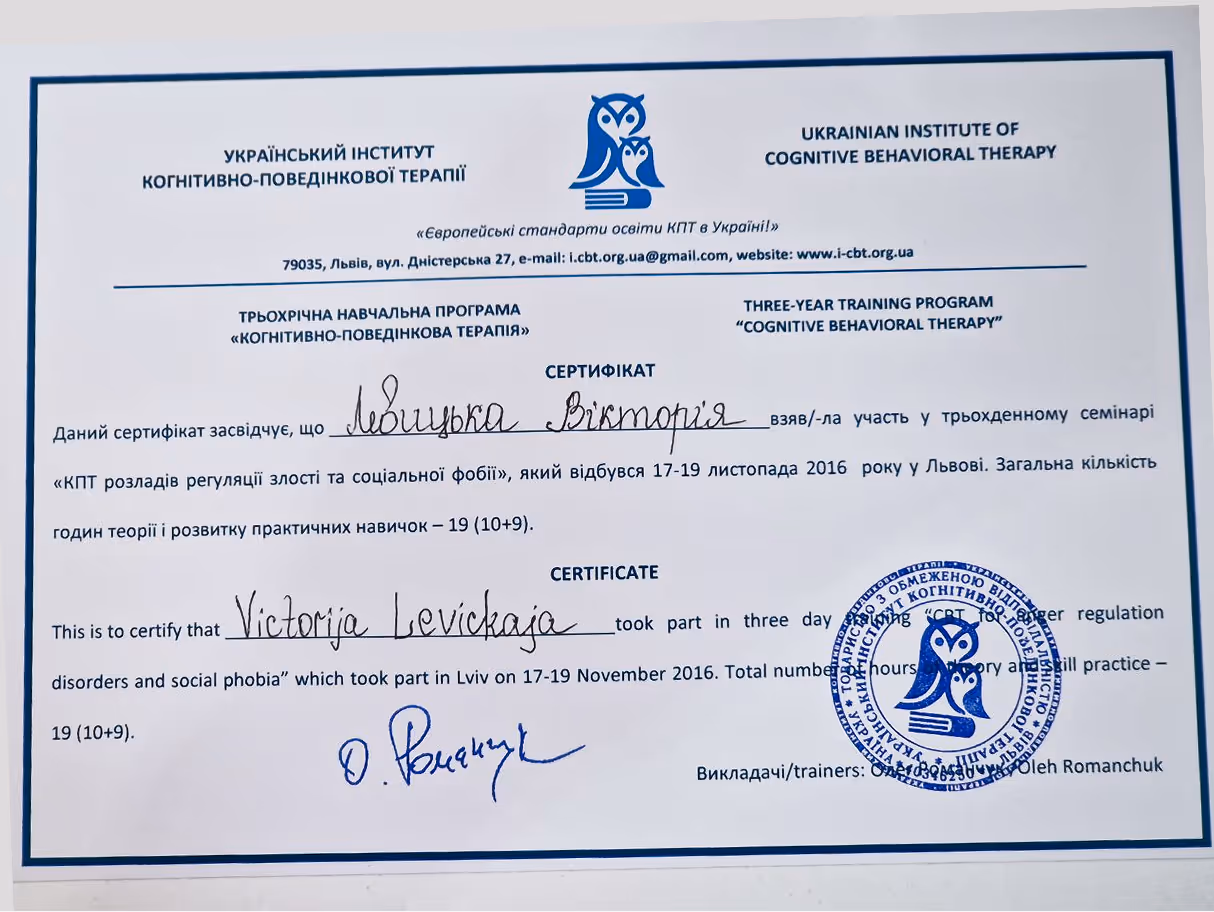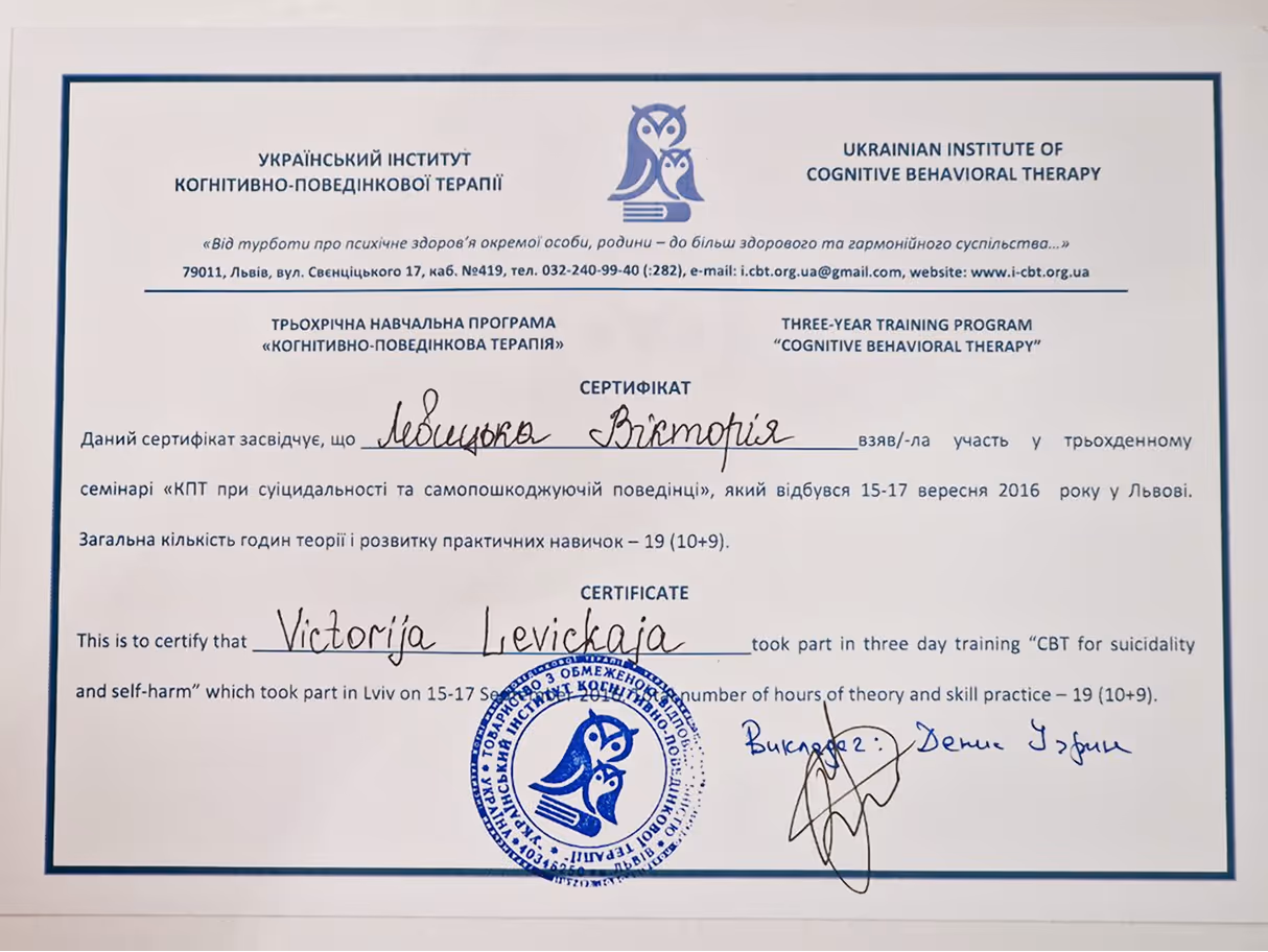 Український інститут когнітивно-поведінкової терапії (УІКПТ, м. Львів) за підтримки Оксфордського центру КПТ (Велика Британія), 2017 р.